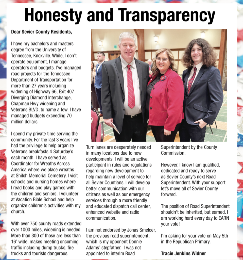 Hi. I am running for Sevier County Road Superintendent and I want to serve you and help our county prosper. I’m a native Sevier Countian and I love this community; its rivers, mountains, and people. After 26+ years of serving you at the Tennessee Department of Transportation, I am looking forward to serving Sevier County in a new capacity.